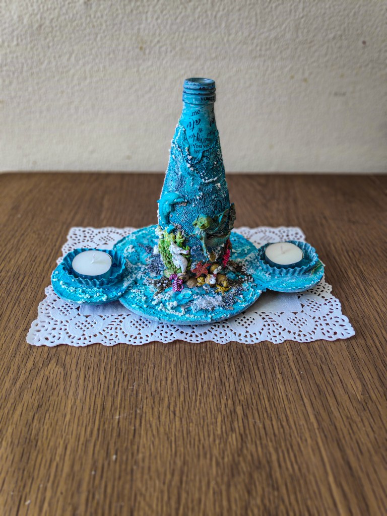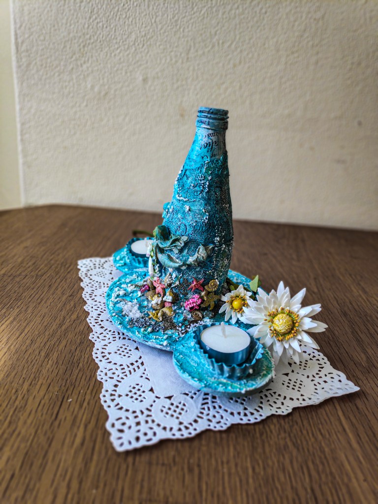 This is my April Monthly submission for Splashy Mix Challenges. The tealight holder cum vase made from an altered glass bottle is adorned with sea elements and is designed for Oceanic dwellers. #splashymix16 I was inspired by the Star Fish and the colour scheme in particular.