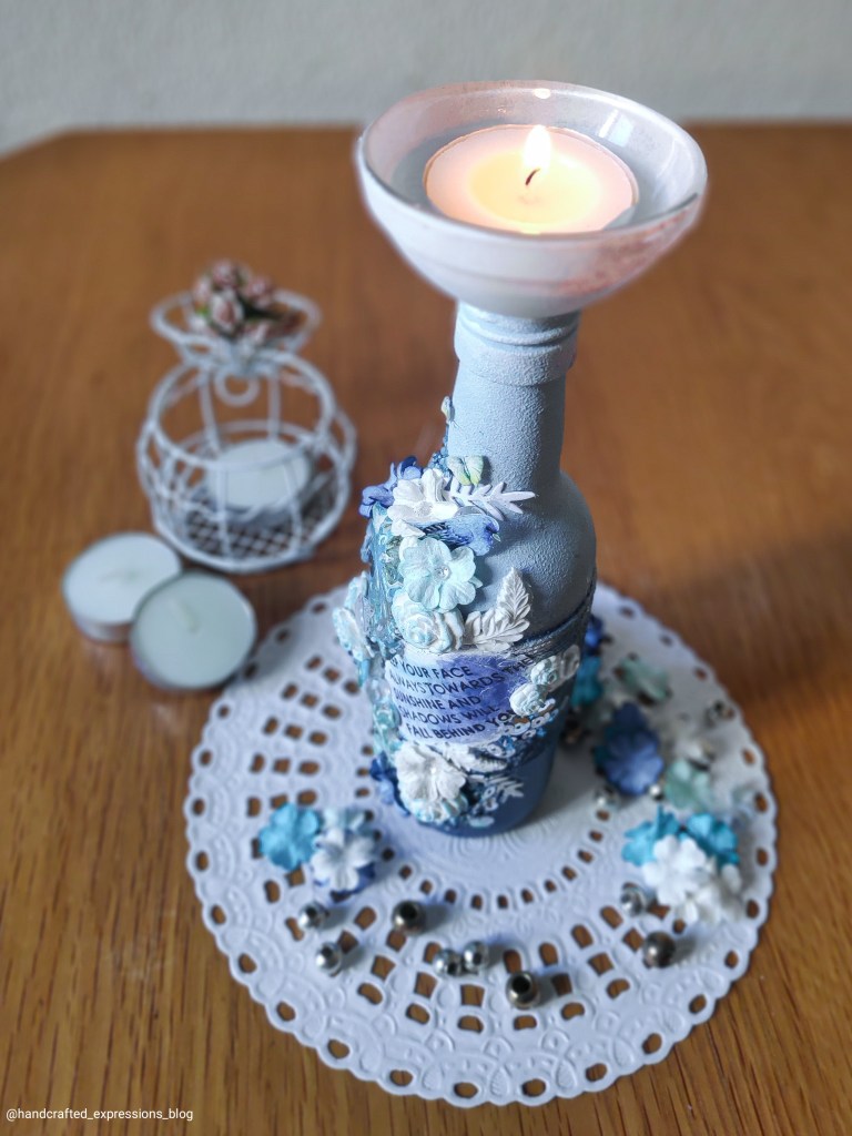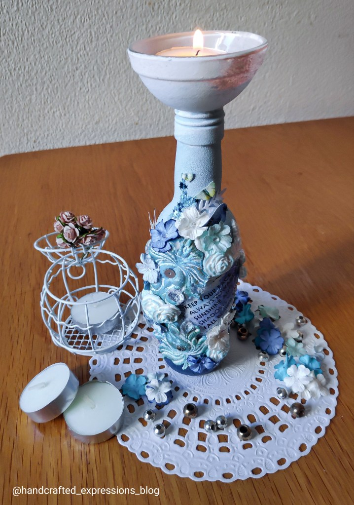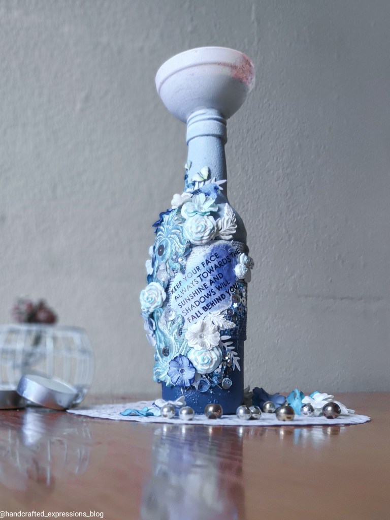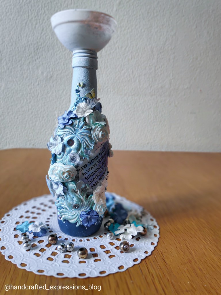 The blue colour shades used on the base are iCraft chalk paints to enhance the beauty of the bottle and show the different shades of blue.