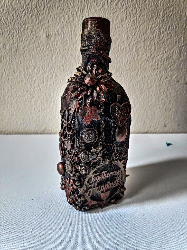 Designed using a old glass bottle, Applied used tissues on the base using glue and then adorned the bottle using wooden embelishments, metal flowers , arty stones. Applied Black Gesso on the bottle and adorned the bottle with Finnabair Wax.
