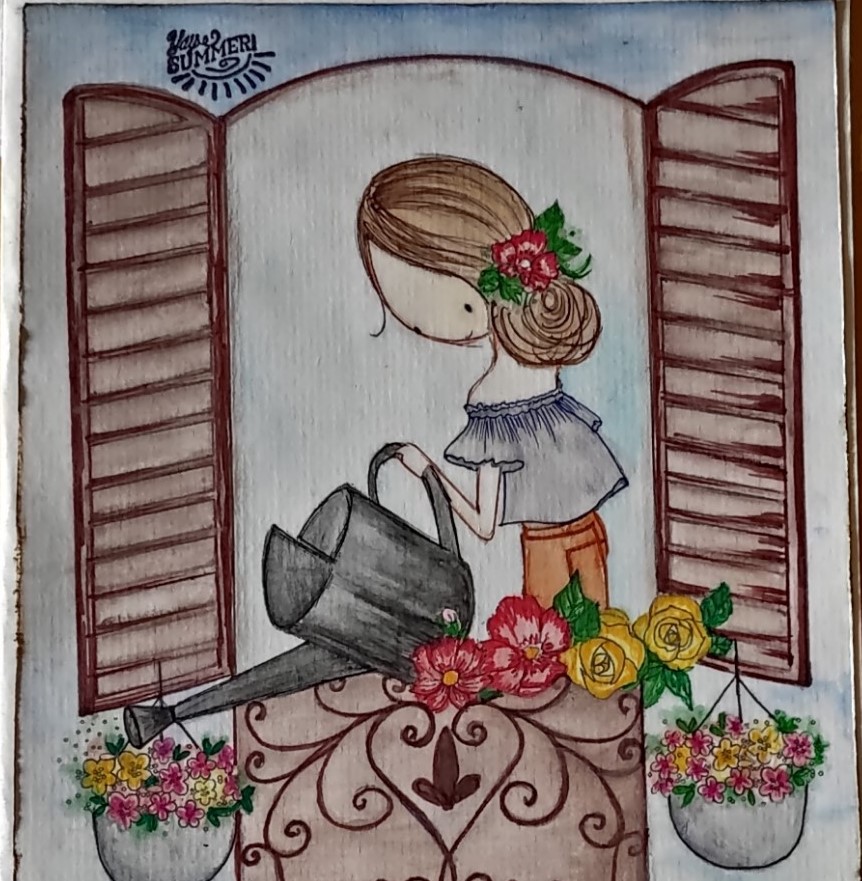 Used White Card Stock in the base and layered the card using grey card stock. Printed the Digi Image on the grey card stock and Coloured using Faber castle water pencils and adorned the card using Copic markers. Used the sentiment stamp “Yes 2 Summer”