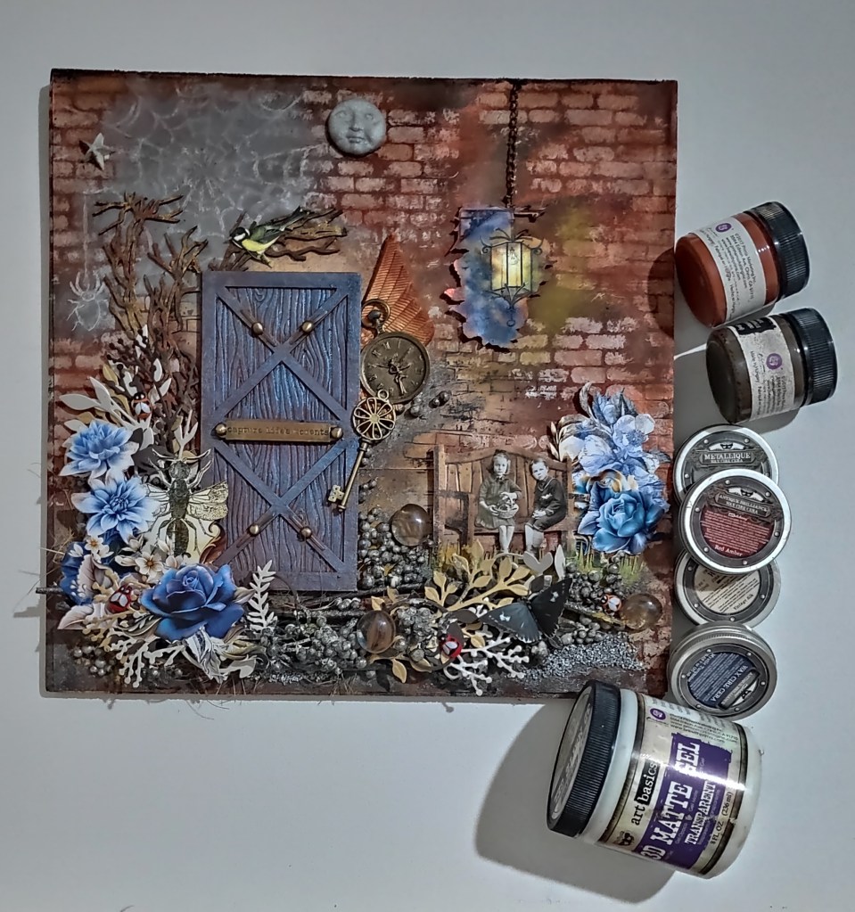 Wax used are Mustic Turquoise used for the door, Brushed Iron used on the Moon, star and cobweb, Vintage Silk and Red Amber is used on Metal elements and background base.