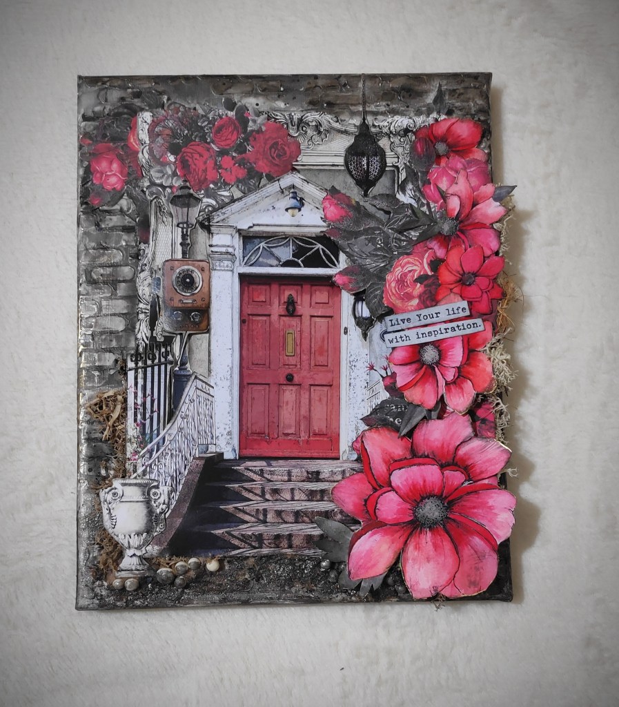 Here is my creation on the fabulous February Moodboard and its Contrast Colors. I have used door as a focal point surrounded with red roses and flowers. I have also showed the contrast of red, white and black on my canvas. I have also showed a depth effect technique for the stair case to the door.