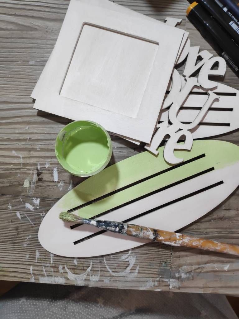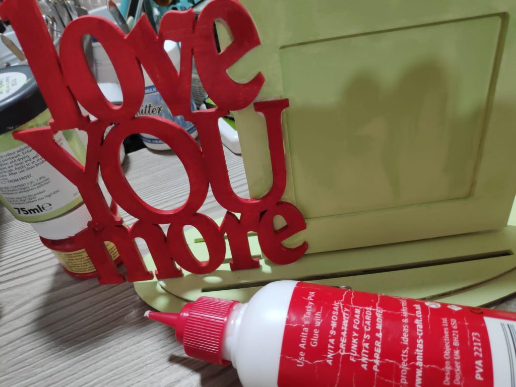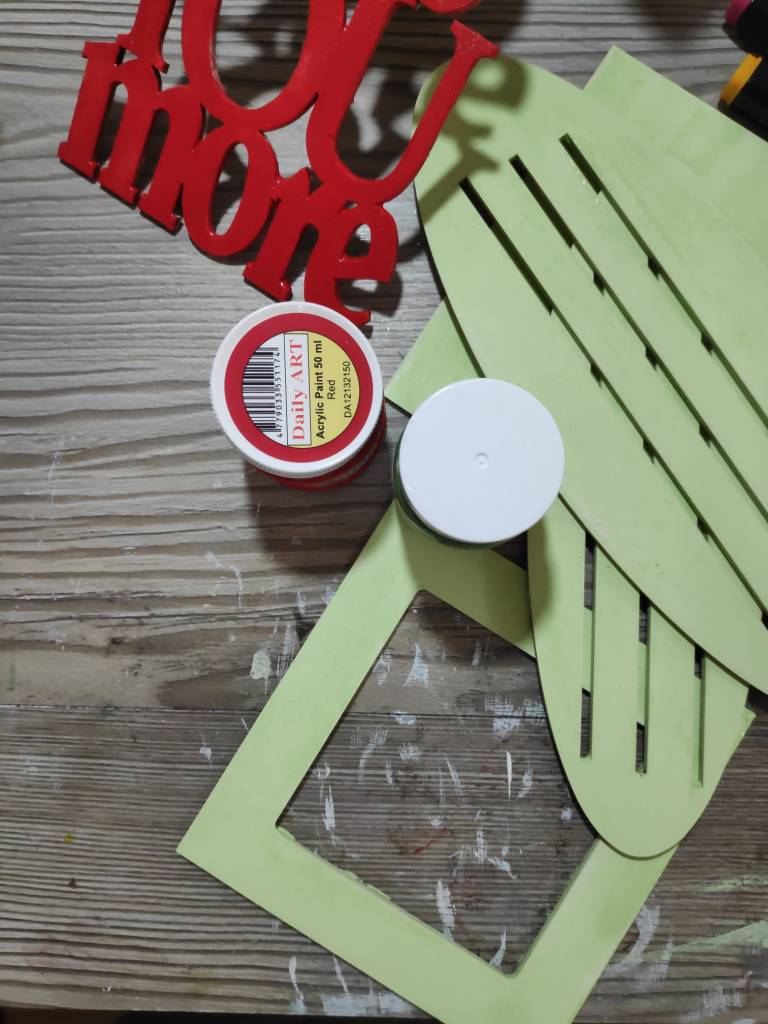 3. I have used Green Acrylic paint to colour the wood frames and red Acrylic paint to colour the word chipboard which reads “Love you more”.